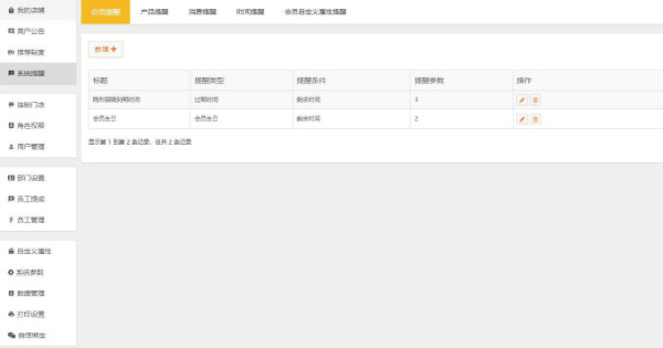 提醒功能实现方法:点击打开“系统设置”中的“自定义提醒”页面,在会员提醒栏中填写标题和参数,新增加的提醒会在主页上显示。