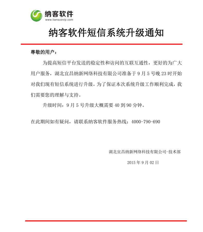 一提高短信平台发送的稳定性和访问的互联互通性,更好的一广大用户服务,湖北宜昌纳新网络科技有限公司准备于9月5号晚23时开始对我们现有短信系统进行升,一了保证本次系统升工作顺利完成,我们需要您的理解与支持。