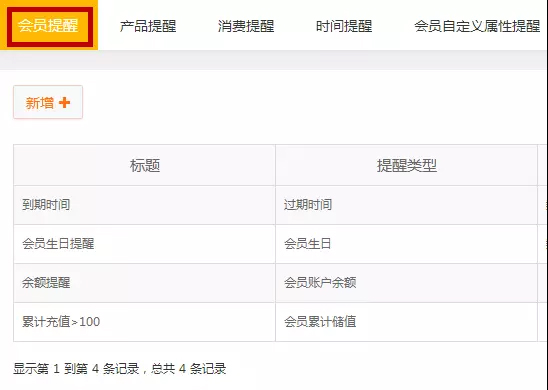 在【营销】→【营销中心】→【营销工具】→【系统提醒】界面中,有5种功能来提醒商和会员,这样商就不会忘记该做的事,会员也对自己的消费情况清清楚楚。