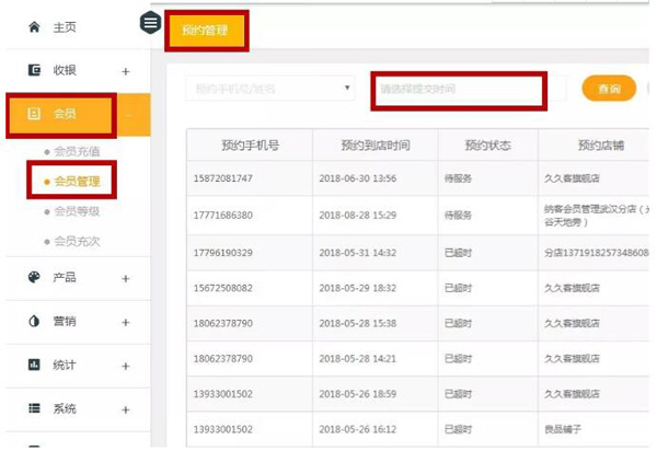 2、【会员】、【会员管理】、【预约管理】界面中,新增按照时间条件筛选查找。