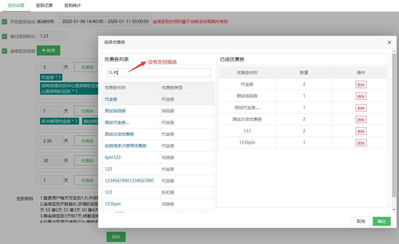 14.签到设置---在选择优惠券界面,优惠券搜索功能没有支持关键词模糊搜索;