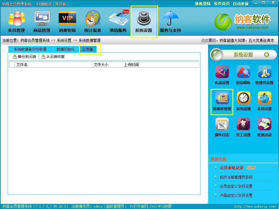 然后找到系统设置模块的数据库管理功能,点击数据库管理,找到“云存储”功能,如下图。