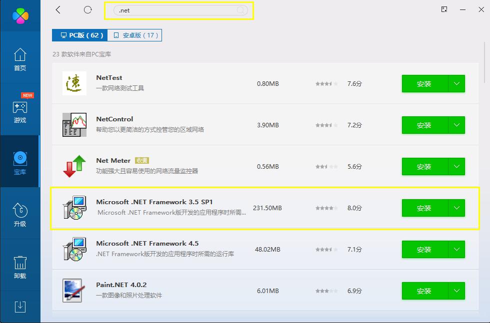 然后搜索“.NET”,然后由于极悦注册软件单机版本需要的是.NET 3.5的支持,所以选择Microsoft .NET Framework 3.5安装即可。
