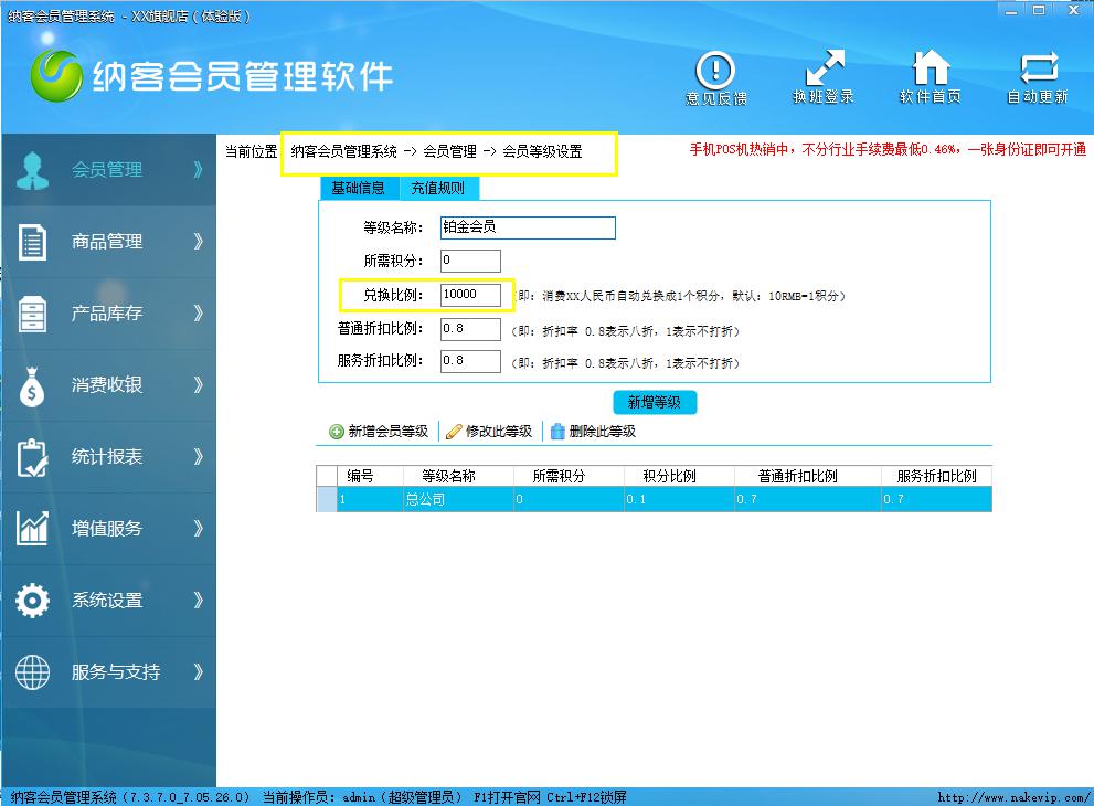 然后在会员等新增的兑换比例一栏中尽可能的填入大数值,如“10000”,然后点击新增等,即可实现没有积分的需求。