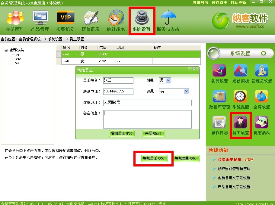然后在系统设置-员工设置-增加员工中添加一个新员工