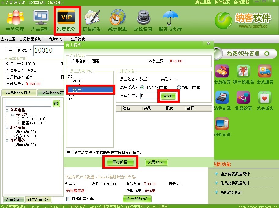 再在消费积分中选择消费商品然后双击,选择员工,选择提成方案