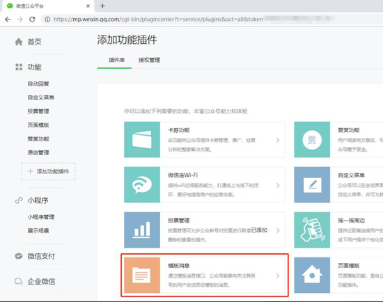 2、进入微信公众号后台,在“添加功能插件”里面选择“模板消息”,申请开通;