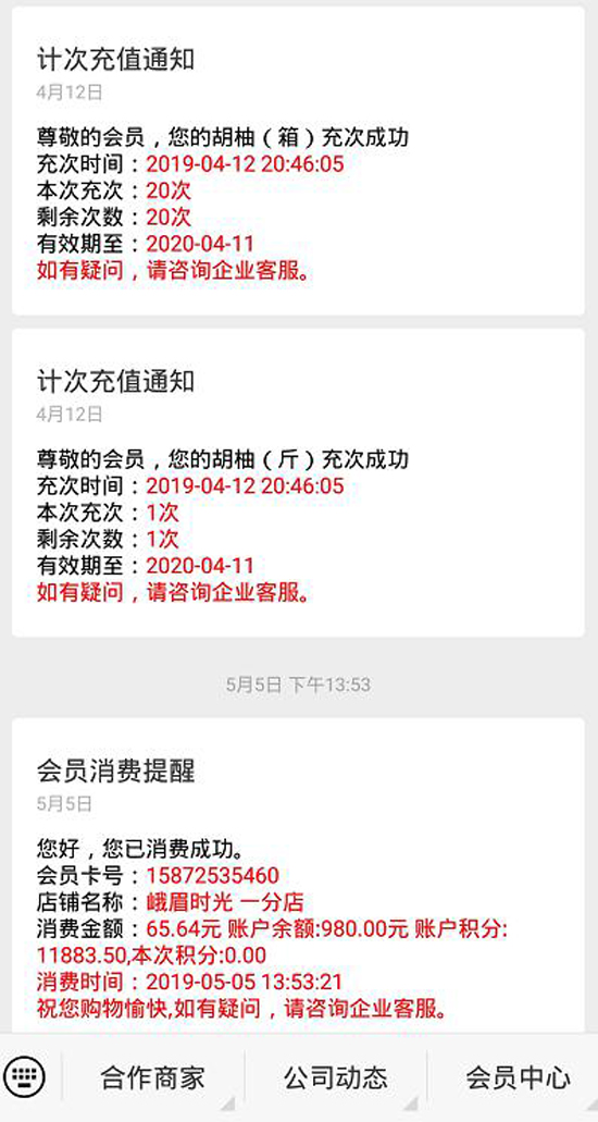 6、会员只要关注了公众号,并且登录了会员信息,每次消费、充值、充次等信息都可以通过公众号推送给会员。