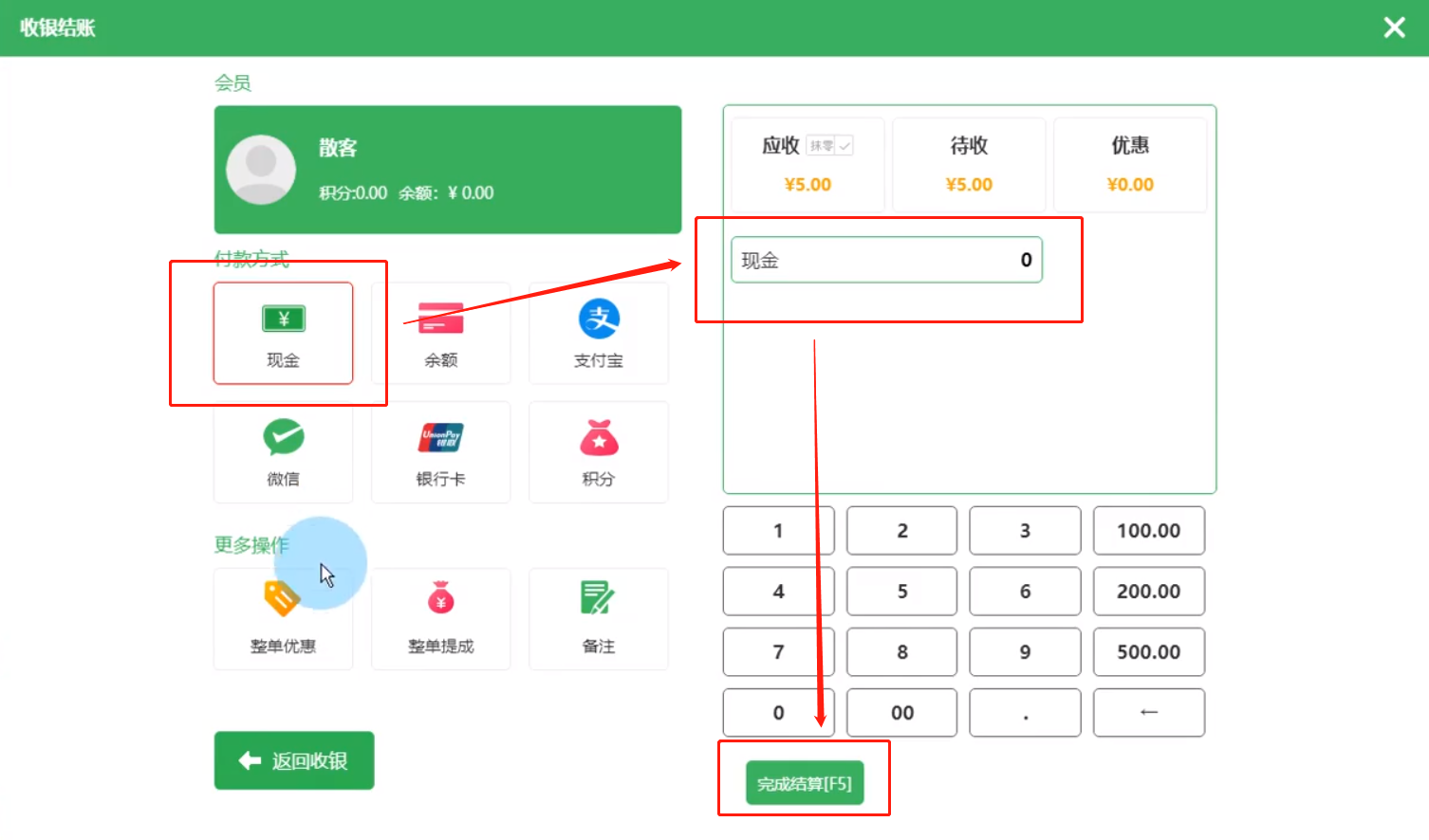 第八步 选择支付方式,点击“完成结算”按钮或按快捷键“F5”。