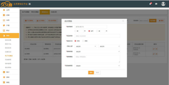 点击“店庆营销”按钮,然后依据提示逐项输入和选择,然后点击保存即可。