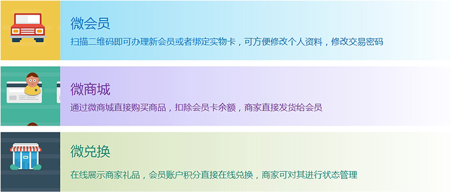 2,微商城:通过微商城直接购买商品,扣除会员卡余额,商家直接发货给会员。